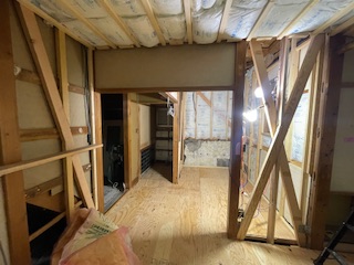 改修工事、断熱材入れなどです、耐震改修のため、開口した壁は、筋交入れ、金物補強後、断熱材入れさせて頂いています。天井の断熱を入れますと現場があったかくなるのを実感します。計算でも天井の断熱で計算しますと効果は数値でも高いですが、体感にて大きく実感します。