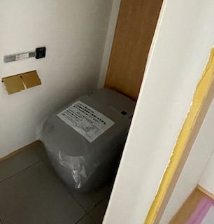 本日はトイレ等設備機器取付などさせて頂きました。トイレはサティス、グレー色です。背面は間接照明と収納になっています。