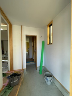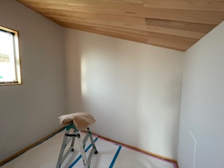 本日は壁ホタテ漆喰塗り1回目と、玄関土間床立ち上げ巾木 墨モルタル、トイレの背面間接収納の照明器具付でした。