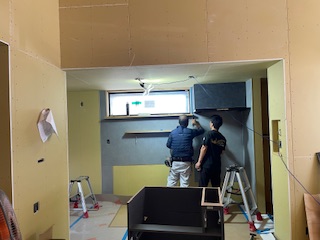 本日は洗面所壁 エコカラット貼り、 クロス下地、パテ工程でした。